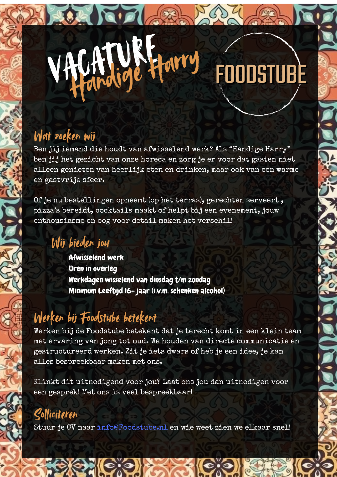 Of heb je nog vragen naar aanleiding van de vacature? Neem ook dan contact op! We praten je graag bij over ons concept. Je ons altijd bellen of mailen, info@foodstube.nl. Tot snel!
